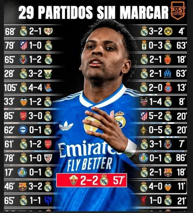 这场比赛之后,罗德里戈已经连续30场比赛、1339分钟没能取得进球,这使他在场次上追平了皇马队史前锋最长球荒的纪录。在这之前,皇马队史不进球场次纪录为马里亚诺保持,但他的出场时间则为986分钟,比罗德里戈少了足足353分钟。