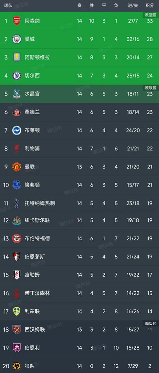 阿斯顿维拉的积分上涨到27分暂列第3名,只落后曼城1分,下一轮要在主场迎战领头羊阿森纳。布莱顿遭遇赛季第4场败仗,以22分暂列第7名。切尔西的发挥不稳定,他们能在欧冠3-0掀翻巴萨,也能在联赛中10人作战1-1逼平阿森纳,但本轮客场对阵保级球队利兹联,爆冷1-3失利,内托打进挽回颜面一球,帮助利兹联建功的是比约尔、田中碧和卡尔弗特-勒温。