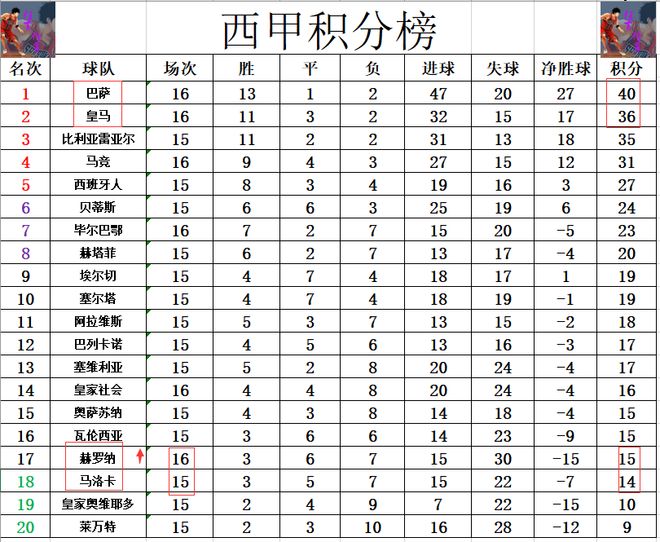 积分榜方面,皇马近段时间的防守犹如豆腐渣,大有崩盘之势,从领先巴萨5分到现在落后巴萨4分。赫罗纳逆转击败皇家社会后,暂时超过马洛卡1分逃出降级区,输球的皇家社会只比降级区高了2分。